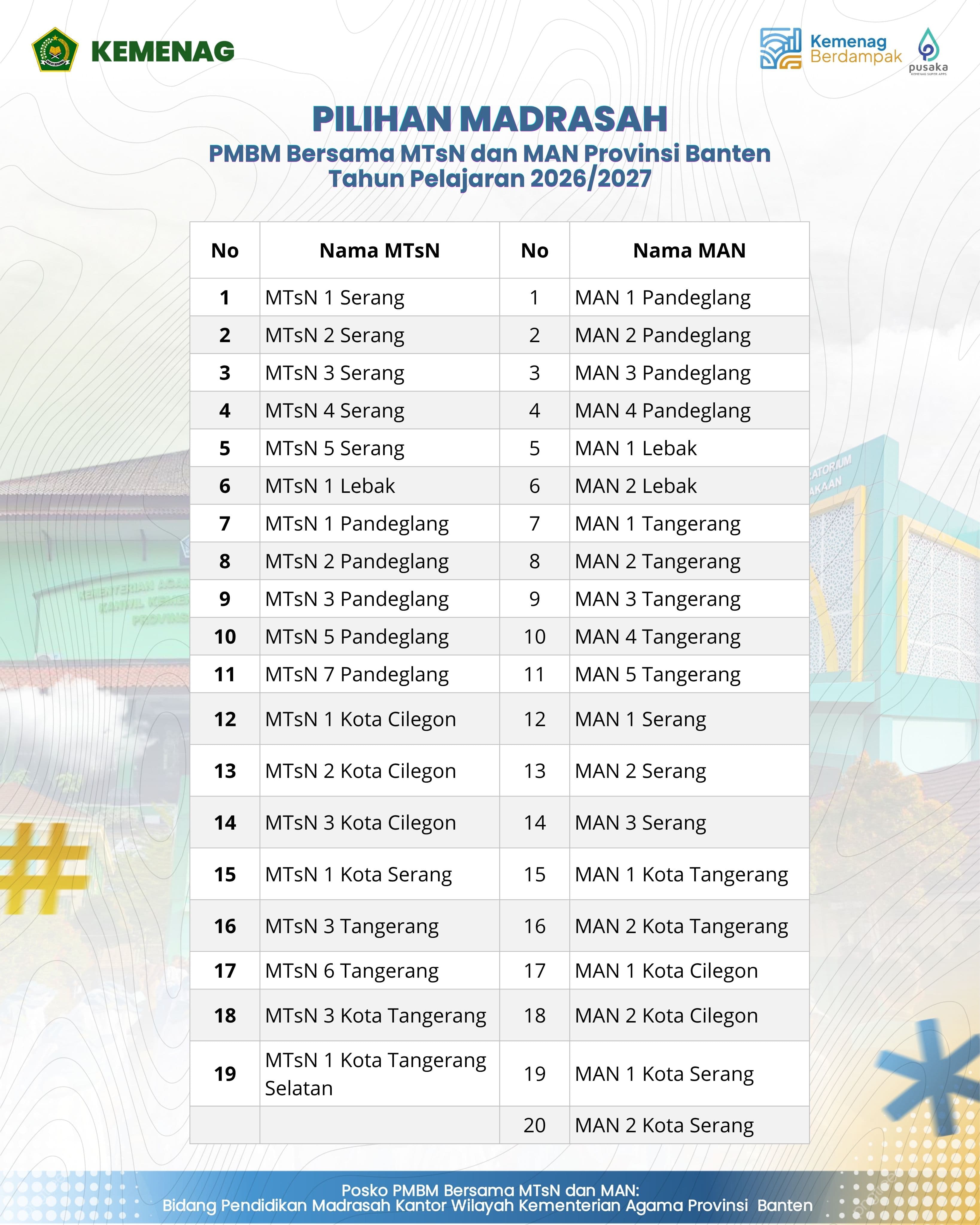 LATAR BELAKANG PENERIMAAN MURID BARU MADRASAH (PMBM) KELAS KHUSUS PENGUATAN KEAGAMAAN Madrasah Aliyah Negeri (MAN) 2 Kota Serang sebagai lembaga pendidikan menengah di bawah naungan Ke